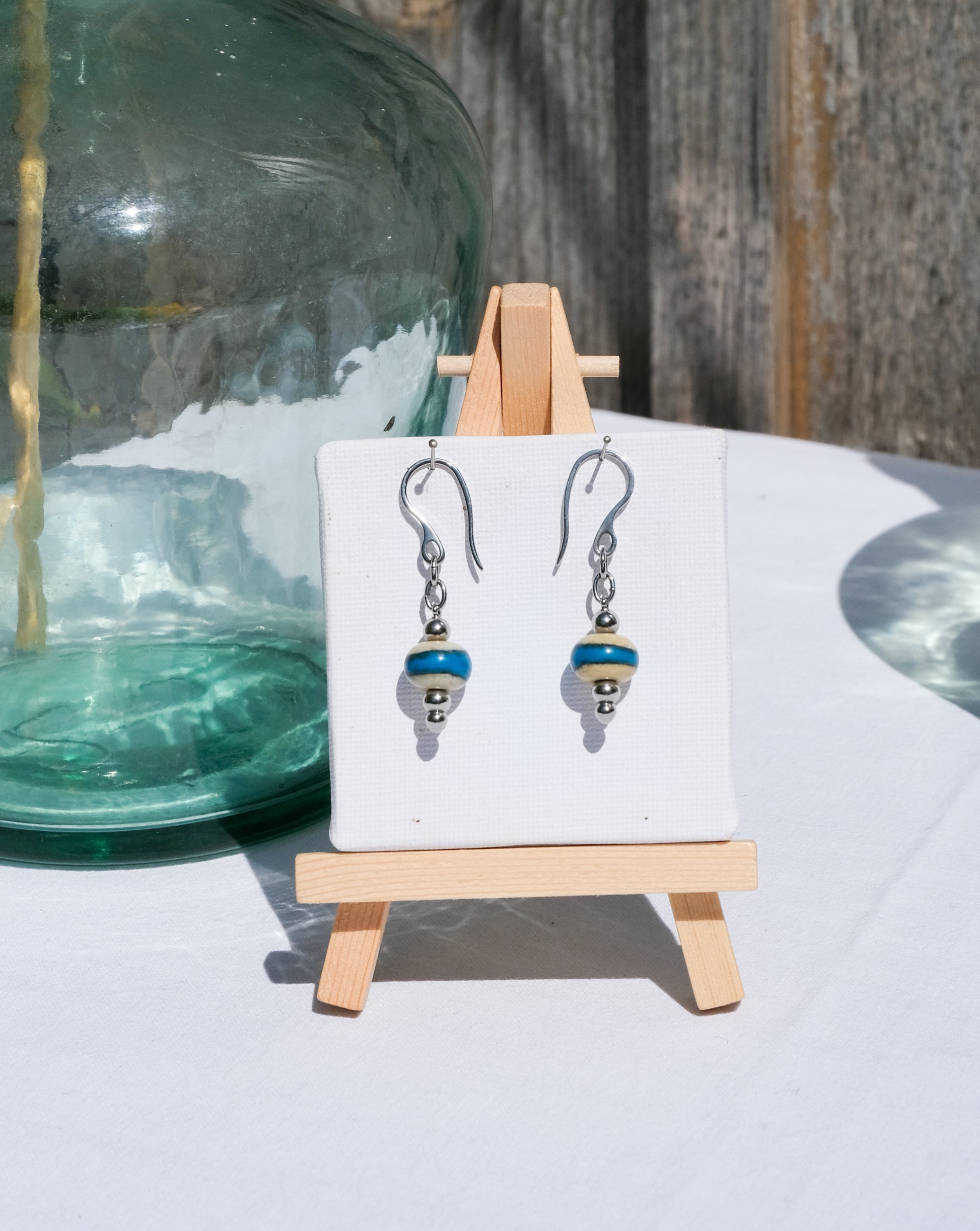 Ces boucles d'oreilles en verre de Murano allient des teintes sable et bleu pour un style naturel et élégant. Les perles en verre sont façonnées à la main, avec des détails argentés qui ajoutent une touche de brillance subtile. Idéales pour un look décontracté ou chic, elles apportent une touche de fraîcheur à toute tenue.