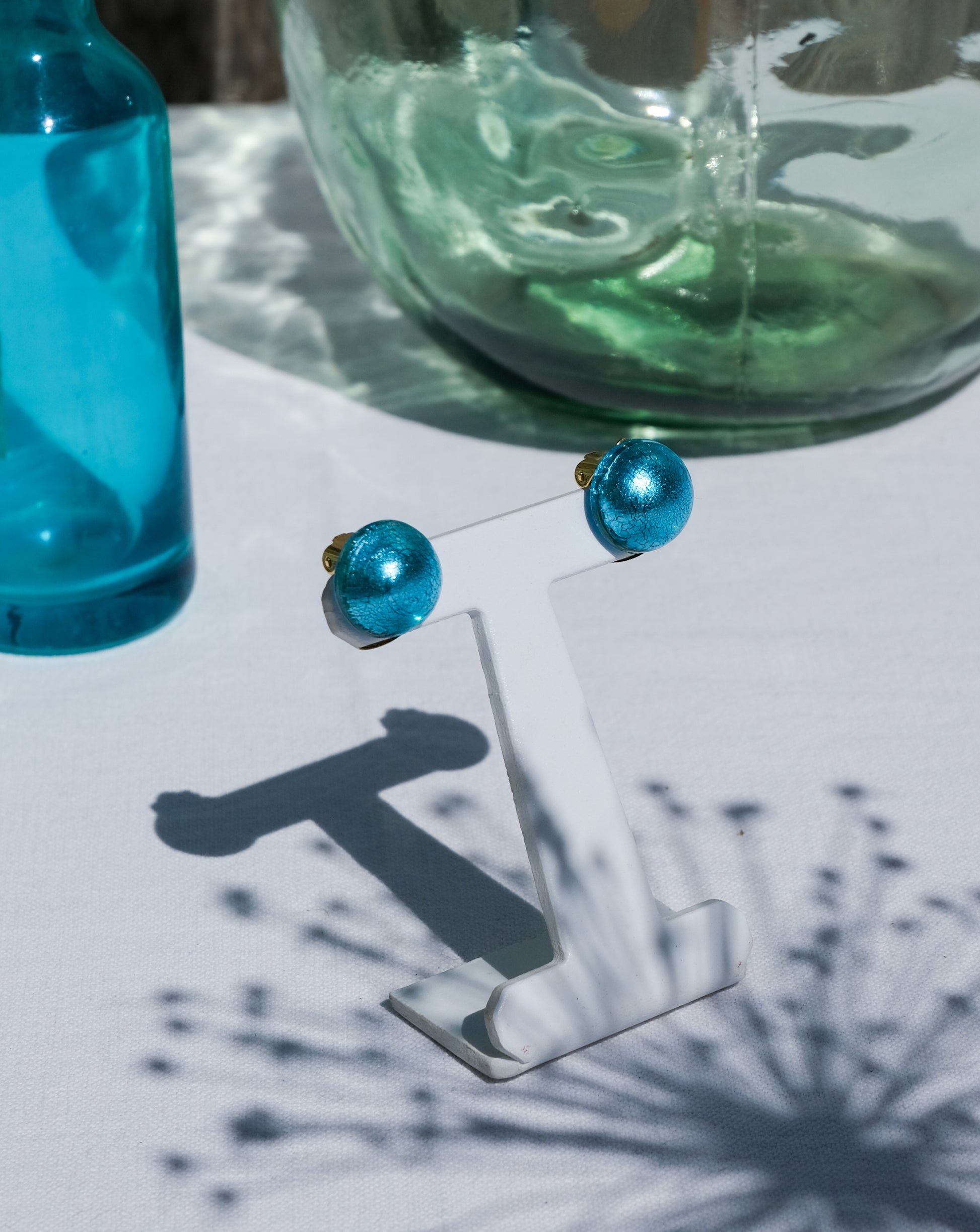 Ces boucles d'oreilles en verre de Murano captivent par leur éclat turquoise. Elles sont rehaussées d’une touche métallisée pour un effet brillant sous toutes les lumières. Parfaites pour les soirées ou les occasions spéciales, elles apportent une élégance intemporelle tout en restant discrètes.