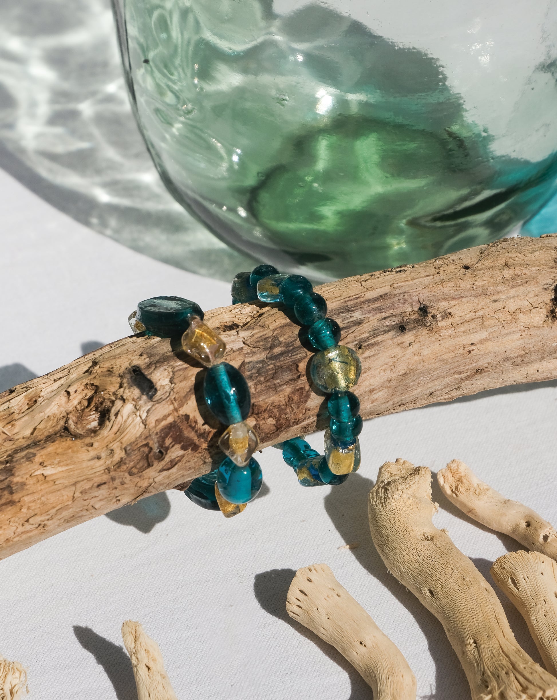 Ce bracelet en verre de Murano combine des perles bleues avec des éclats dorés subtils, évoquant les couleurs de la mer et du sable. Idéal pour une touche estivale ou pour ceux qui aiment les teintes naturelles et lumineuses. Les perles, toutes façonnées à la main, confèrent un caractère unique à chaque bracelet, en faisant un bijou aussi spécial qu’élégant.