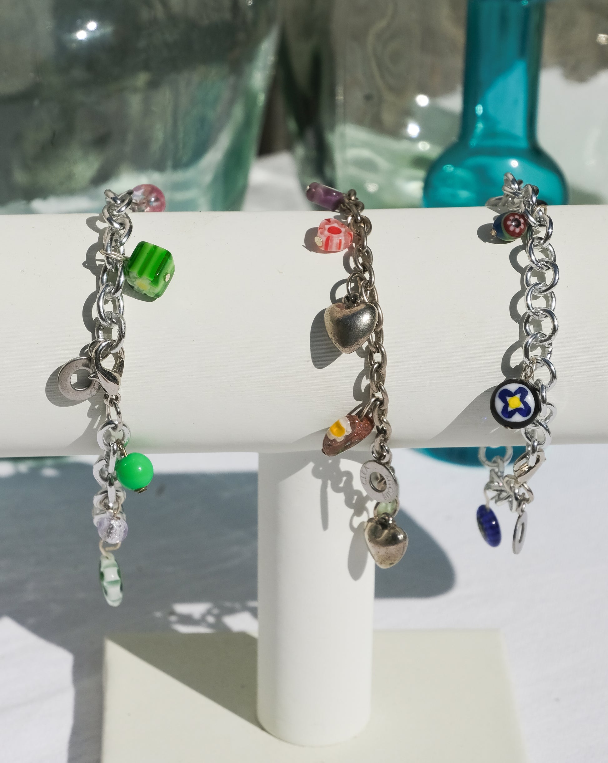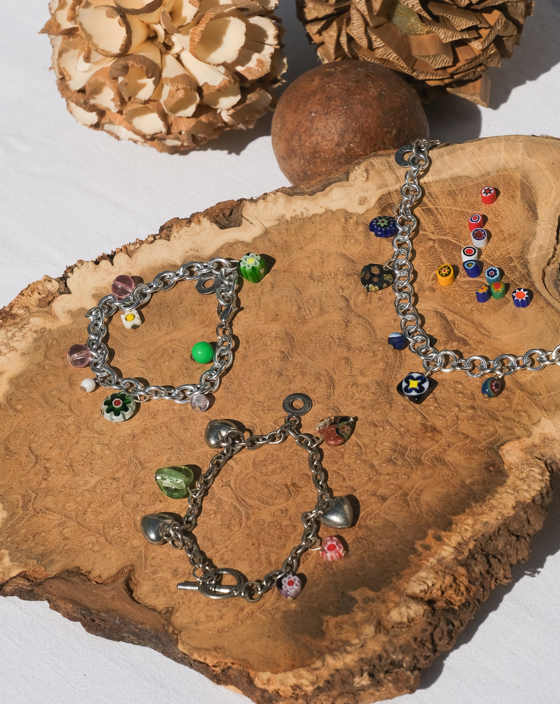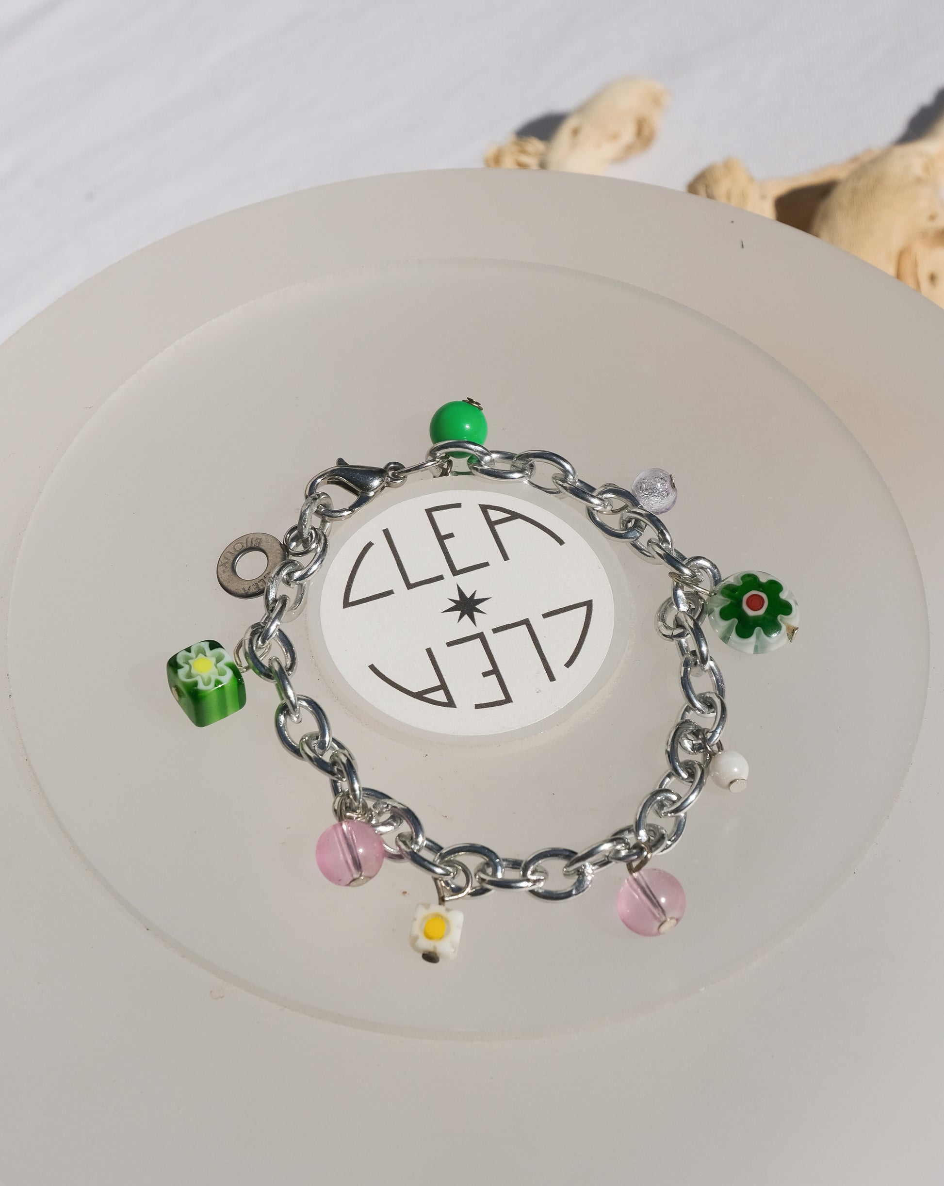 Ce bracelet à chaînes est orné de petits charms en verre de Murano évoquant des fleurs printanières. Les perles multicolores apportent une touche de gaieté et de fraîcheur, parfait pour le printemps ou l'été. Chaque charm est minutieusement façonné à la main, offrant une touche unique et ludique à votre poignet.