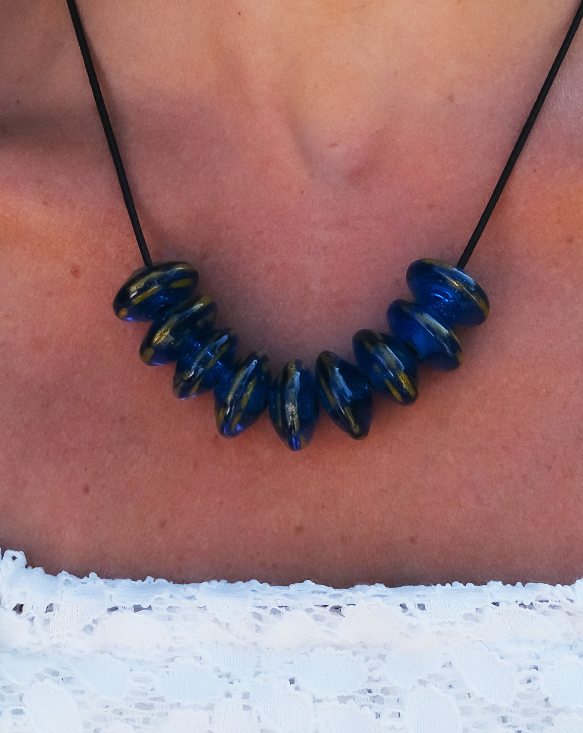 Ce collier bleu nuit en perles de verre de Murano dégage un charme mystérieux et élégant. Chaque perle est soufflée à la main, capturant les nuances profondes du bleu et des touches dorées.