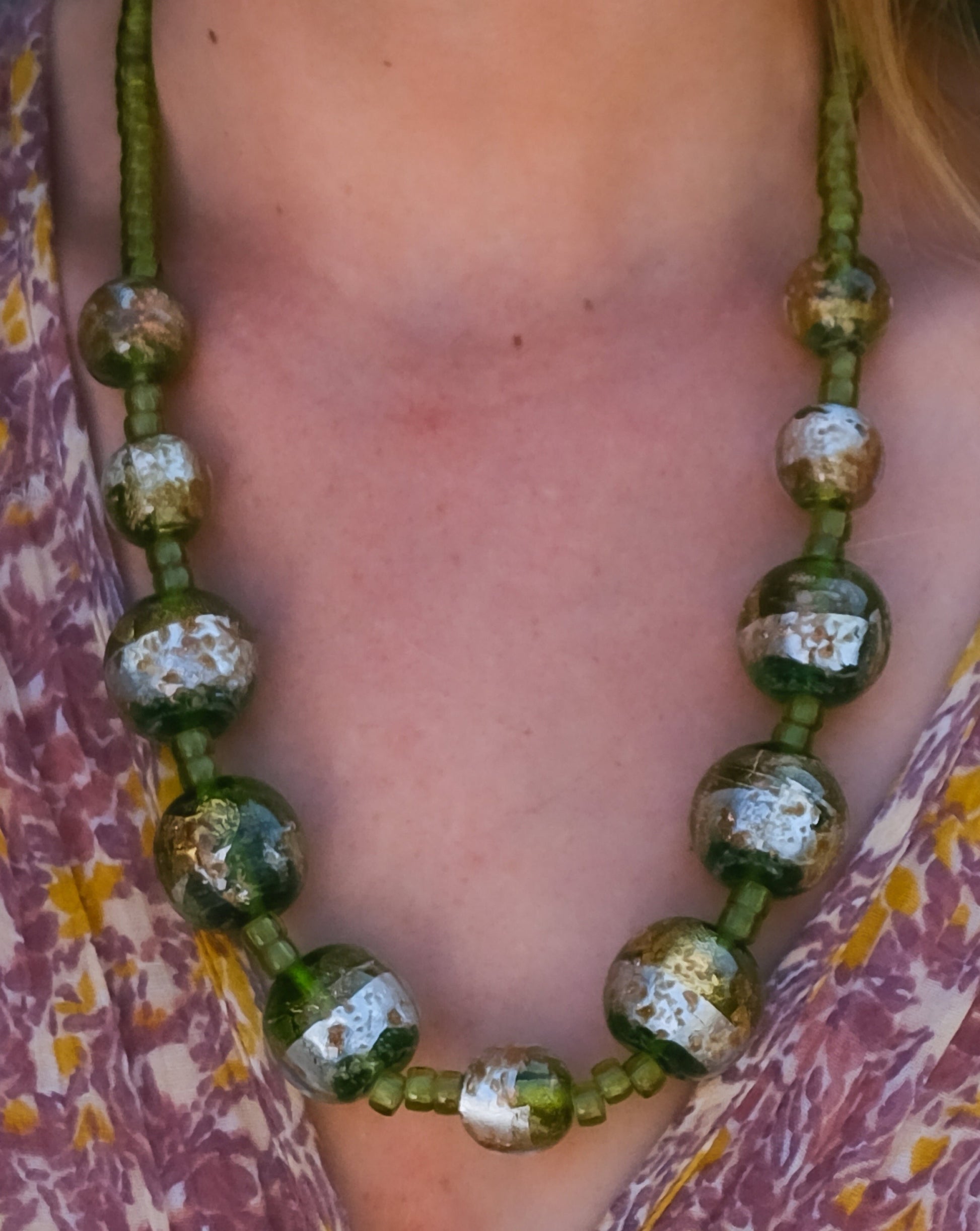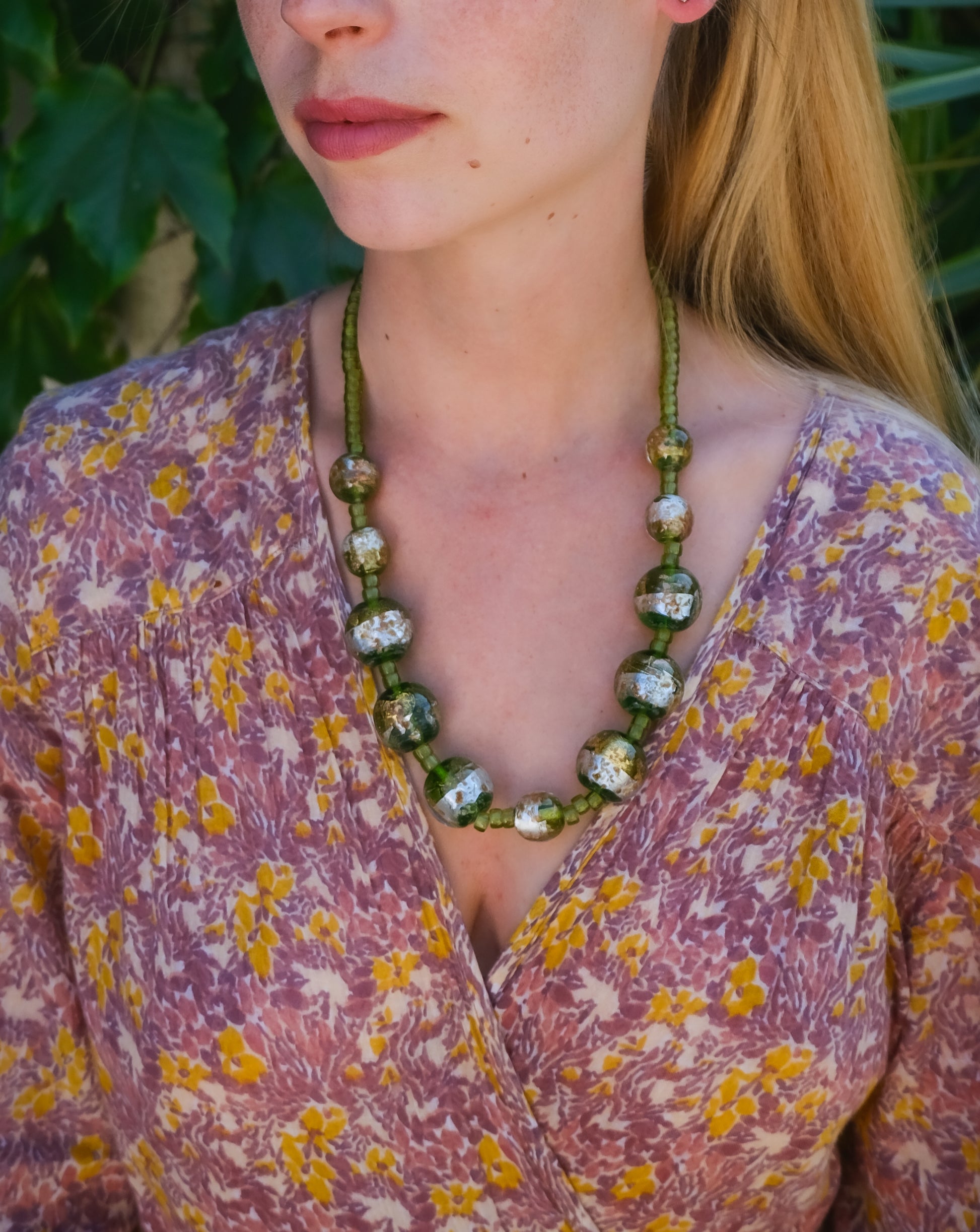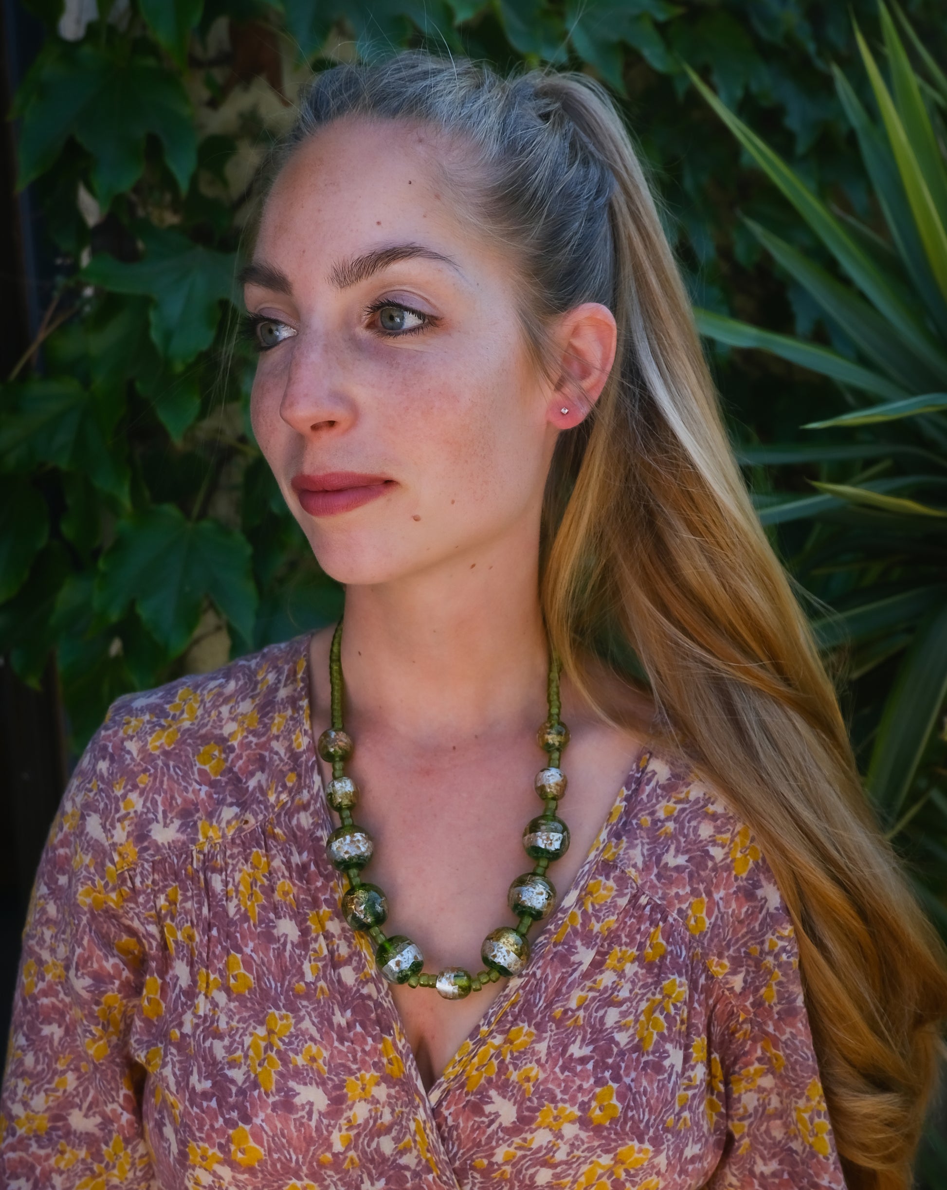 Ce collier est une véritable ode à la nature, avec ses perles vertes ornées de motifs dorés. Chaque perle, soufflée à la main, capture la lumière de manière unique, créant un effet de brillance subtil mais saisissant. Ce collier est idéal pour les amatrices de bijoux raffinés et organiques, qui aiment marier élégance et naturel. Parfait pour un style décontracté ou plus habillé, il deviendra rapidement un incontournable dans votre collection de bjioux.