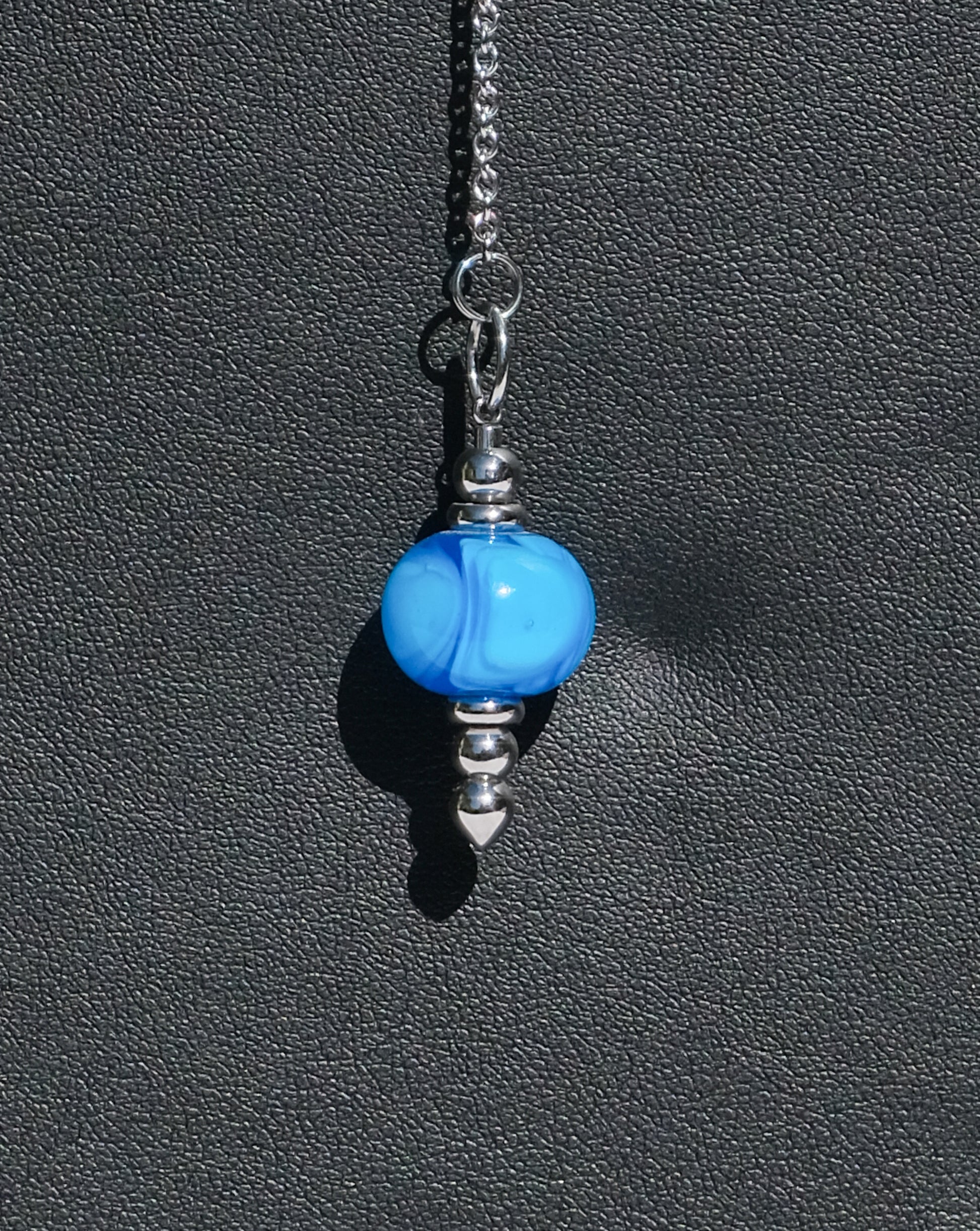 Ce pendule bleu ciel en verre de Murano captive par sa simplicité et son élégance. Le verre soufflé à la main est rehaussé de détails métalliques argentés, conférant une touche moderne à cet objet traditionnel. Léger et facile à manipuler, ce pendule est parfait pour les pratiques de méditation.