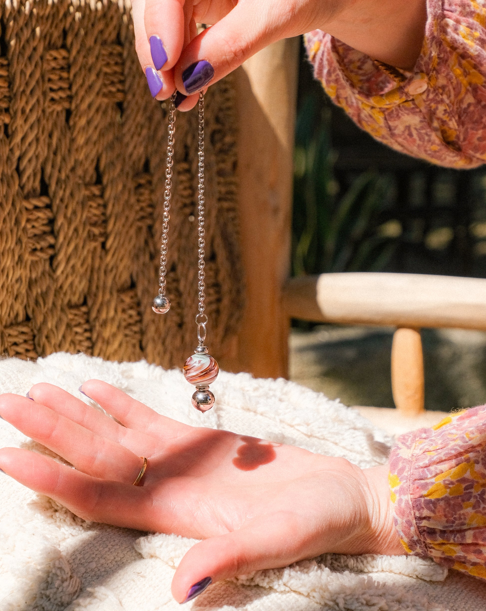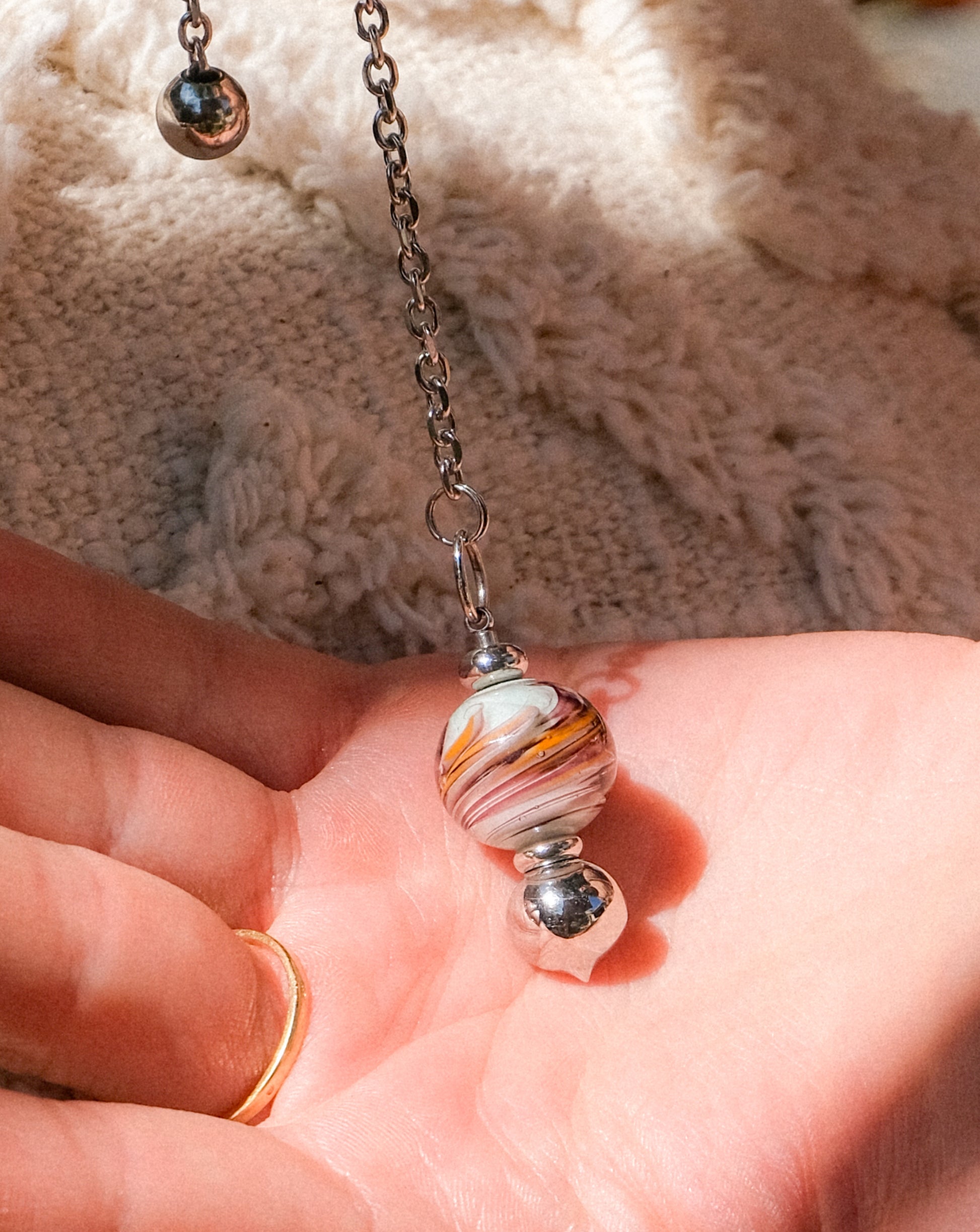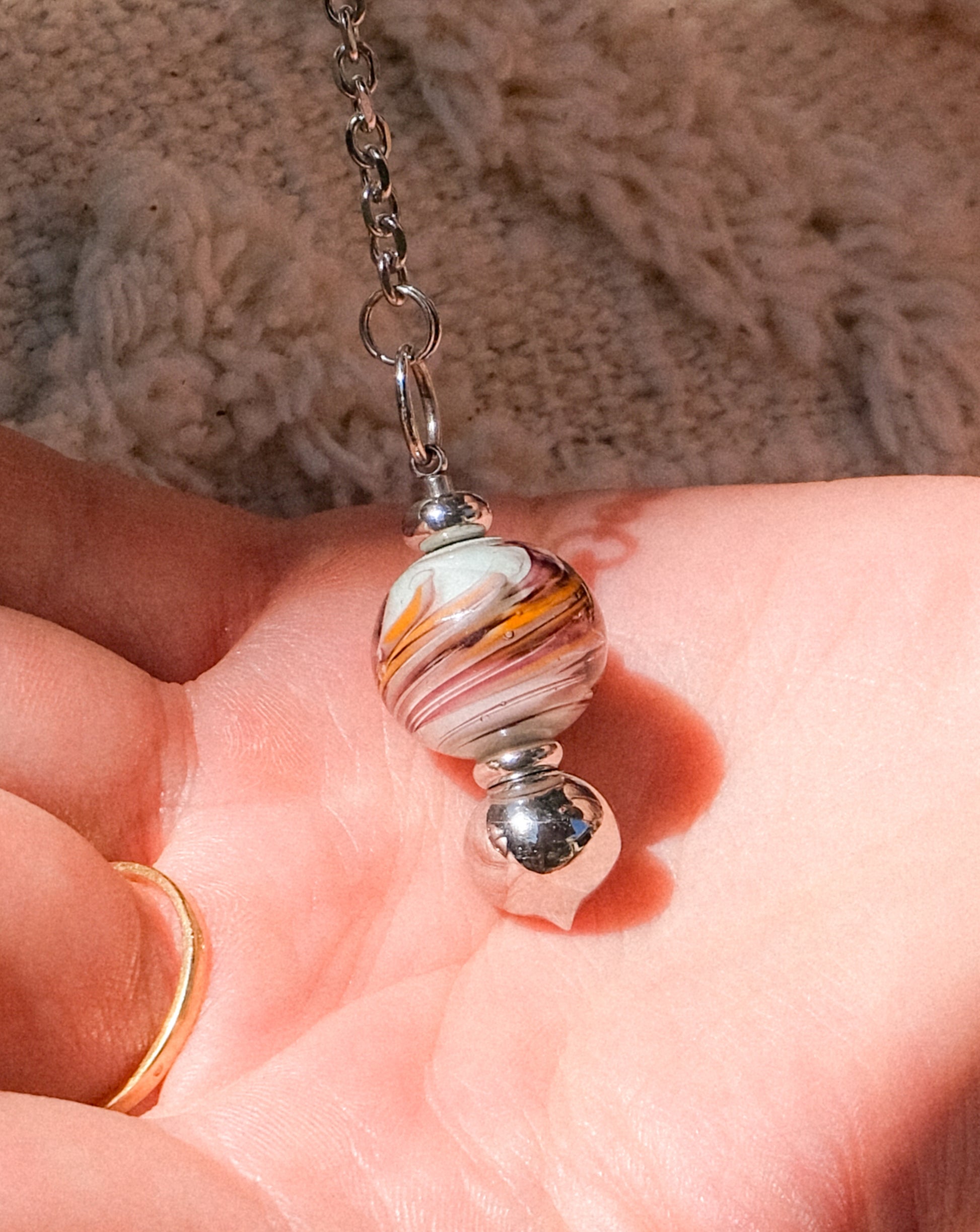 Ce pendule en verre de Murano combine des teintes chaudes et naturelles dans un motif tourbillonnant. Léger et bien équilibré, il est parfait pour les pratiques de méditation ou de divination. Sa finition subtile, associée à des détails métalliques argentés, en fait un accessoire aussi décoratif que fonctionnel, idéal pour ceux qui apprécient un style naturel et épuré.
